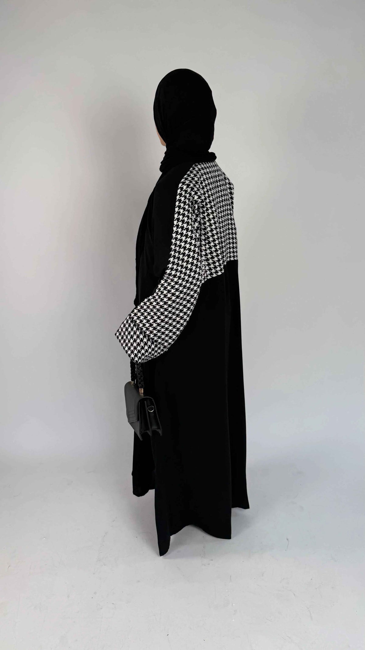The houndstooth patterned sleeves and upper panel add a chic designer touch, beautifully contrasting against the smooth black body for a statement look that remains modest and refined.